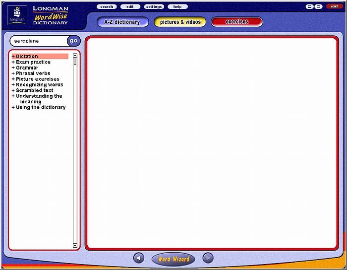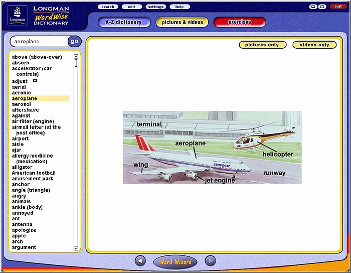 左のペイン(pane)にイラストなどが付属する見出し語のリストがアルファベット順に並び、見出し語をダブルクリックすると、右のペイン(pane)にイラストや写真、動画を表示します。動画の場合のみ、辞書本文と同じ、見出し語と発音記号、定義文、例文なども追加で表示します。