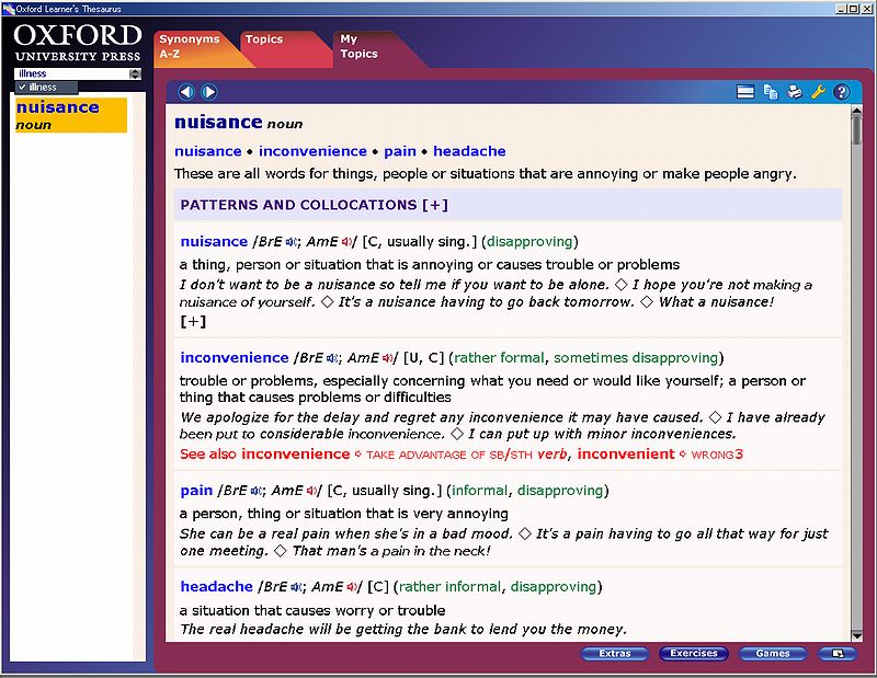 上記の画面では、"Topics"として"Illness"を登録し、見出し語"nuisance"とその類義語などを書き込んでいます