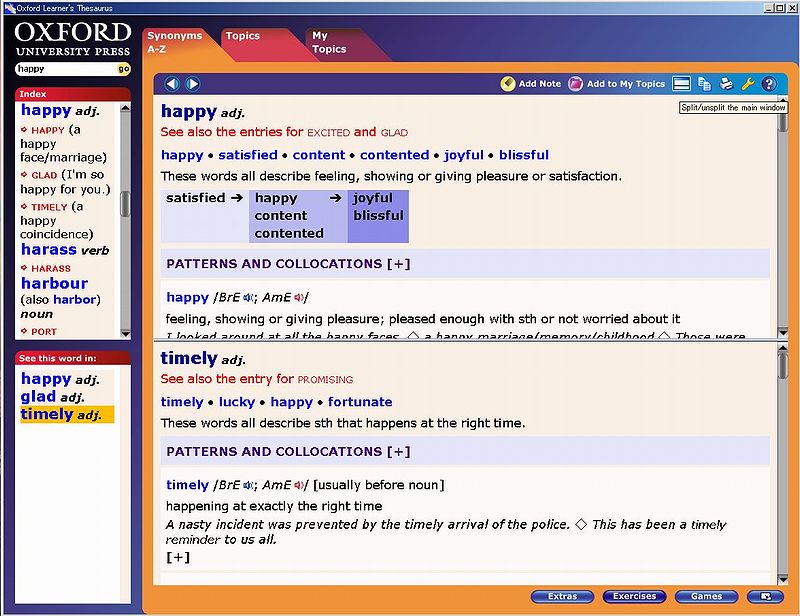 メインウインドウの右上部にある[Split/Unsplit the main window]ボタンを押すと、右側のペイン(pane)を上下に分割します。それぞれのウインドウに対して、通常の検索が可能。上記の画像は、上のウインドウで"happy", 下のウインドウで"timely"を見出し語として検索した結果画面です。ウインドウの分割位置は、マウスのドラッグで自由に変更可能。