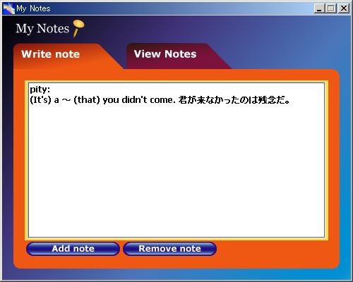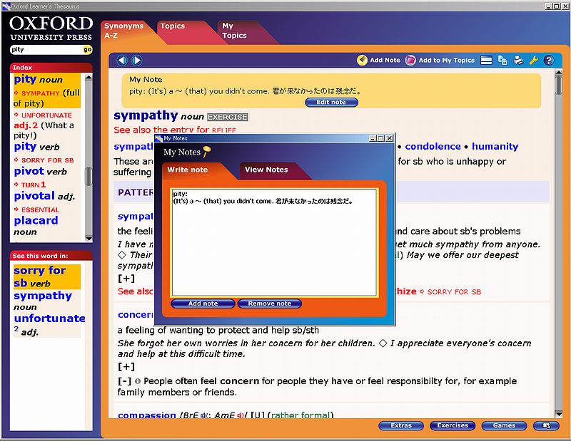 上記の画像の場合、"pity: (It's) a 〜 (that) you didn't come. 君が来なかったのは残念だ。"という一文を、見出し語"sympathy"に登録しています。"My Notes"はアプリケーション終了後も、消去されず、次回以降の起動時にも継続して参照することができます。