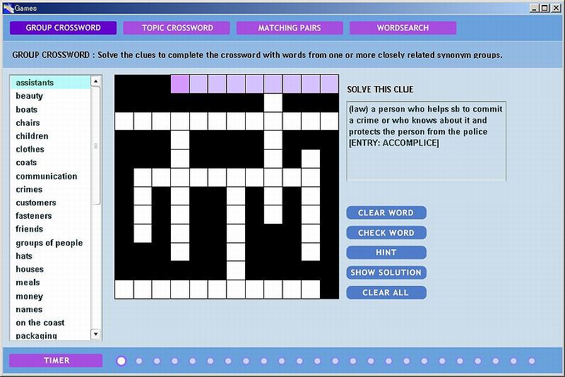 メインウインドウ下部の[Games]ボタンをクリックすると、類義語を題材にしたゲームが四つ出て来ます。(1)クロスワードパズル×二種、(2)類義語の神経衰弱、(3)隠れた単語探し。いずれのゲームも一分少々の時間制限があります。
